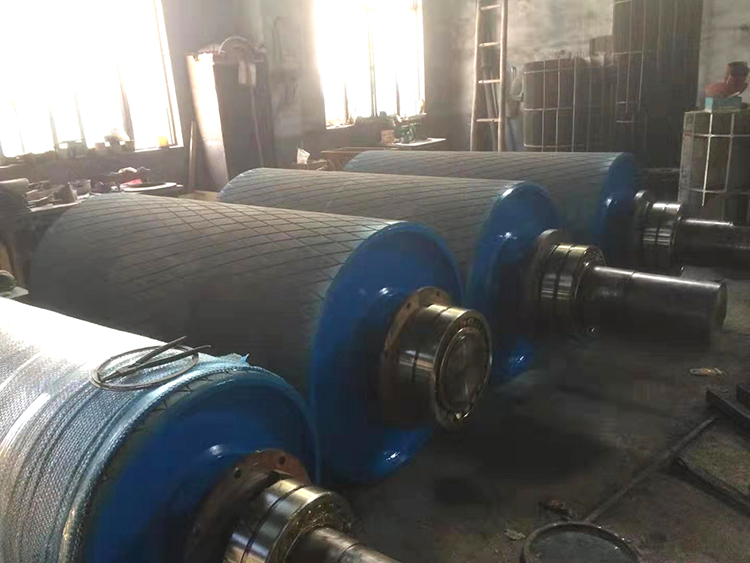 傳動滾筒是輸送機(jī)傳遞動力的部件。傳動滾筒表面有裸露光鋼面,人字形和菱形花紋橡膠覆面。小功率、小帶寬及環(huán)境干燥時(shí)可采用裸露光鋼面。人字形花紋膠面摩擦系數(shù)大,防滑性和排水性好,但有方向性。菱形膠面用于雙向運(yùn)行的輸送機(jī)。